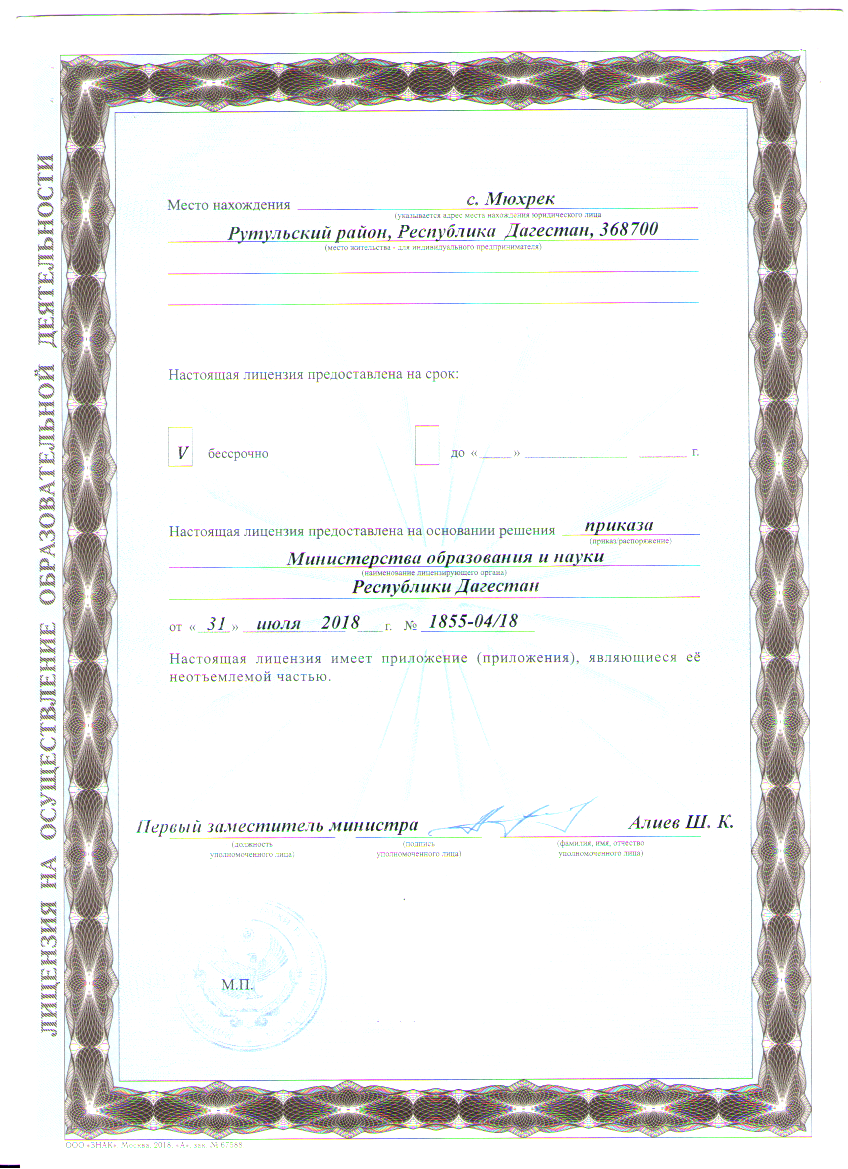 | Адрес местонахождения образовательной организации* | 368700, республика Дагестан, Рутульский район, село Мюхрек |